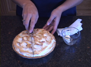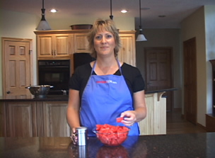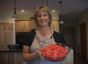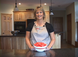 Today I am going to demonstrate how to slice a watermelon and at the same time, remove most of the seeds. The first step to slicing a watermelon is to make sure you have the outside washed off completely. The first slice you are going to want to make is to cut ends off the watermelon on both sides. The next step in slicing a watermelon is to cut the watermelon lengthwise right along where the light and dark stripe meet and a good indicator on how deep you need to go is to reach right where the seed line begins. So go ahead and slice the watermelon right along that stripe and you are going to want to skip approximately 4 inches and a good indicator of that is to skip every other line. Continue to cut around the watermelon until you have all of your cuts made. Once you have all your cuts made, you are ready to separate it from the seed line. Just take your fist and give it a quick bang and all the sections will come apart. Once you have your watermelon broke into sections, the next step is to remove the center portion of the watermelon. You will want to take your knife and place it just above the seed line to remove this section. Now you may get some seeds in here and that is okay they are easily removed, just take the tip of your knife and remove them from the pieces of watermelon. Slice the watermelon right below the seed line. Take the tip of your knife and remove any excess seeds. After you have removed all the seeds from your wedges, the next step is to remove the fruit from the rind. Insert your knife right where the fruit, the red part of the fruit meets the green of the rind and slice all the way through. You may have to touch up a little bit and continue through all the wedges. Once the watermelon has been removed from the rind you can go ahead and slice it into your desired serving size. Take your knife and slice down the middle and chunk it however you like. Once your watermelon has been cut up it is ready to serve or to use in your favorite recipes, for more information on watermelon and to find some great watermelon recipes, visit www.Recipetips.com.