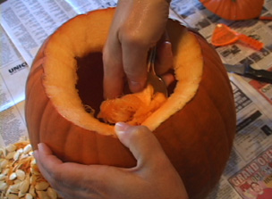 Hi! This is Laurie from RecipeTips.com, and today, I am going to show you how to roast pumpkin seeds. Once you have cleaned out the inside of your pumpkin, go through and separate the seeds from the pulp of the pumpkin. Make sure to rinse them under cold running water and then allow them to drain. Once you have rinsed the seeds, drained them, and patted them dry, add one tablespoon of vegetable oil per one cup of seeds. Make sure that they are all coated really well, and then pour them out onto an ungreased cookie sheet. Spread them out into a single layer, and then you are just going to add one teaspoon of salt per cup of seeds, but you can put as much salt on as you would like. Place the seeds in a 300 degree preheated oven for approximately 45 to 55 minutes, making sure to shake them every 10 minutes to prevent them from burning. Once the seeds are golden brown, remove them from the oven and allow them to cool, and they are ready to enjoy. For more great pumpkin recipes, visit RecipeTips.com.