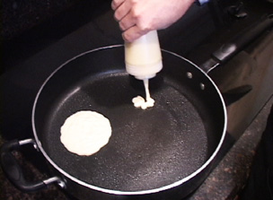 Hi! This is Laurie from RecipeTips.com. Today I am going to show you how to make easy-pour pancakes. Whip up your favorite recipe for pancakes and then just pour it into a squeeze bottle that has a wide tip on it. If necessary, go ahead and cut the tip off the squeeze bottle top to make the batter flow more easily. Using a squeeze bottle makes it easy to have your pancakes all the same size; and when you are done making pancakes, if you still have batter left, go ahead and put the whole container in the refrigerator until you are ready to make pancakes the next time. Using a squeeze bottle also makes it easy to make fun designs for your kids. My kids love the Mickey Mouse pancake. Put blueberries or chocolate chips to make the eyes and the nose and the mouth. For more easy cooking ideas, visit RecipeTips.com.