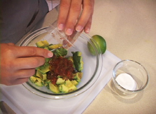 Hi there! This is Laurie from RecipeTips.com. Today I am going to show you how to make a really easy guacamole. Start by slicing your avocados and removing the pit, and then just make sure you baste the avocados with some lemon juice to keep them from turning brown. A really easy way to remove the flesh of an avocado is to take a knife and just make a crisscross pattern down to the skin of the avocado; then you just take a spoon and scoop it out and put it in a bowl and it is already nice and diced. This recipe calls for three avocados and a quarter cup of salsa. Choose any kind of salsa you like and it can be however hot you like it. Just dump everything in on top of the avocados; and you want about a teaspoon of salt, and this can be a guesstimate: it is kind of your preference, how ever you like it. The last ingredient is one half of a fresh lime, juiced on top. Sometimes it is best to go ahead and roll the lime on a flat surface to get the juices flowing before you try to squeeze it. Using a fork, go ahead and start mashing the avocados and the rest of the ingredients. If you like a chunkier guacamole, go ahead and use a potato masher; if you like creamier guacamole, use a hand mixer. Once you get it to the desired consistency, it is ready to serve. Now you can serve this with chips as an appetizer, or it is a great condiment to any of your Mexican foods. For more great recipes like this one, visit RecipeTips.com.