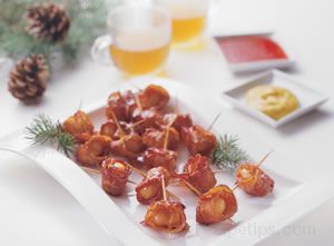 Ingredients -7 slices HORMEL® Fully Cooked Bacon, each piece cut in half. - 1 can (8 ounce) whole water chestnuts, drained - 1 cup barbecue sauce - Toothpicks |